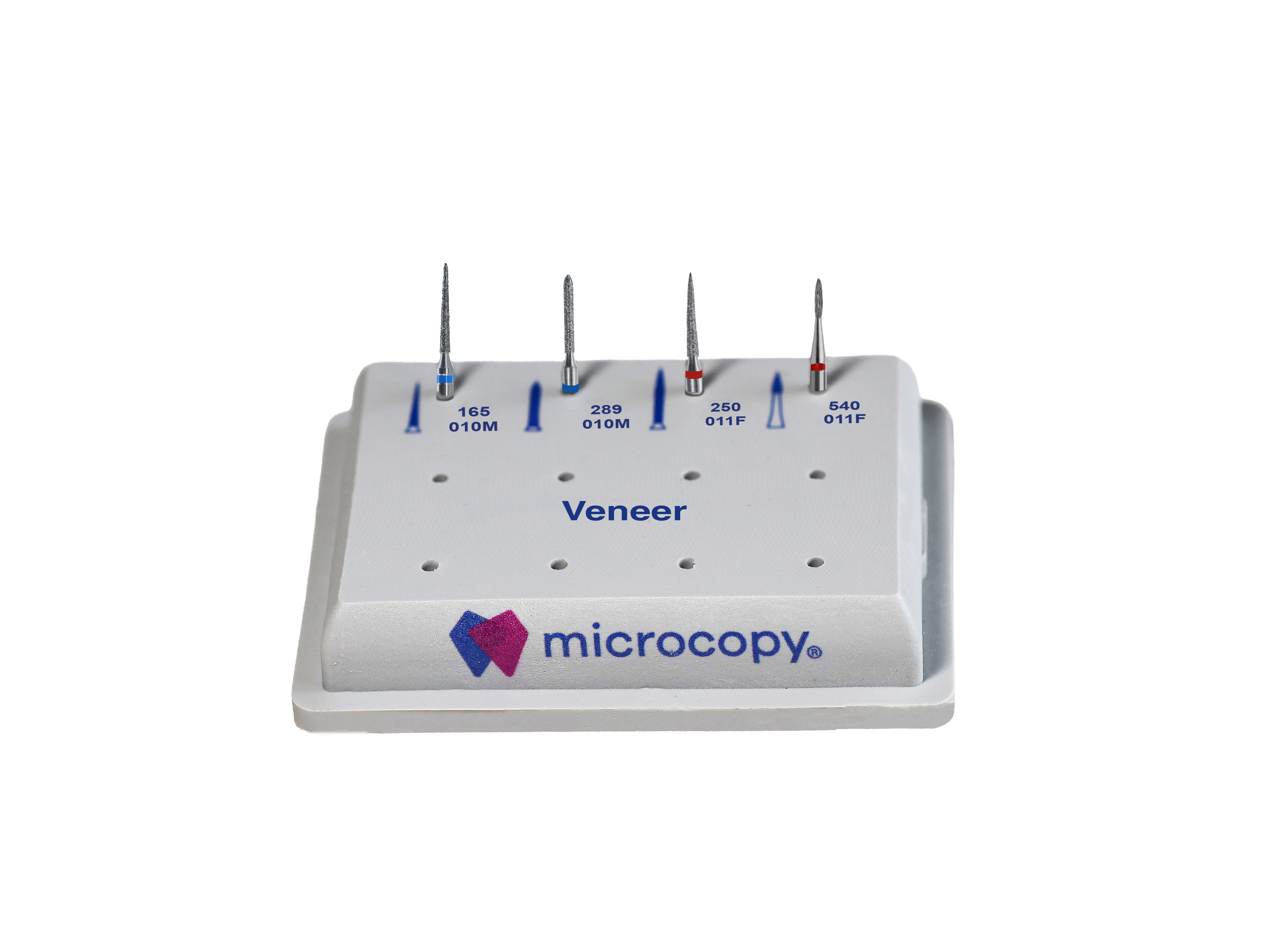 Our veneer kit features four Microcopy NeoDiamond burs selected by Dr. Roberto Turrini, a world-renowned expert in aesthetic dentistry. Each bur serves a specific purpose in creating an efficient and predictable veneer preparation. Since Microcopy’s burs are pre-sterilized and ready to use straight out of the pouch, they integrate seamlessly into the veneer preparation workflow, helping clinicians achieve accurate reduction, refined margins, and consistent esthetic outcomes. This streamlined approach enhances procedural efficiency, preserves healthy tooth structure, and elevates the overall patient experience.